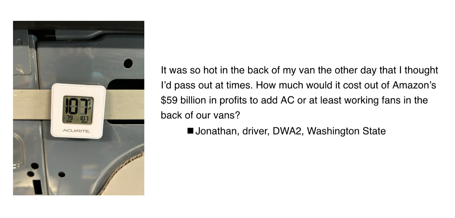 - Action #1—Thermometer photos + heat map: Check out the Amazon Prime Heat Survey page. There's a form to write your heat stories and upload photos of the temperature at your worksite, and we'll gather all of those into a heat map and report to share publicly, in line with the heat report created by Amazon KSBD workers and the Warehouse Worker Resource Center in 2022.